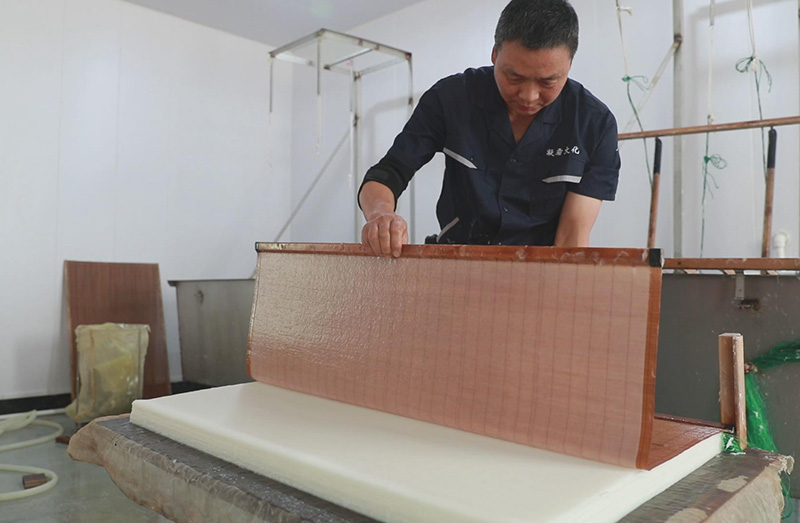 徽州楮皮紙起源于北宋,是利用當(dāng)?shù)靥赜械蔫ぶ谱鞒鲞m合書畫使用的一種紙品。2003年,非遺傳承人朱建新創(chuàng)辦公司,致力于徽州楮皮紙的傳承和發(fā)展。2018年徽州楮皮紙被錄入中國手工紙文庫,2019年徽州楮皮紙制作技藝成為了黃山市非遺傳承項(xiàng)目。 徽州楮皮紙的制作主要分為6個(gè)步驟,揀料:去除黃莖